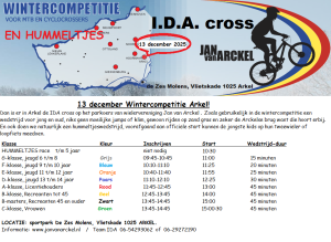 Omdat de wedstrijd in Giessen Oudekerk niet doorgaat is er nu in Arkel de IDA cross op het Jan van Arckel parkoers. Zoals gebruikelijk een wedstrijd voor jong en oud, niks geen moeilijke jumps of klim, gewoon rijden op zand en gras en ook de Arckelse brug want die hoort erbij. Natuurlijk doen we een hummeltjeswedstrijd, voorafgaand aan de officiële start kunnen de jongste kids op hun tweewieler of loopfiets meedoen.